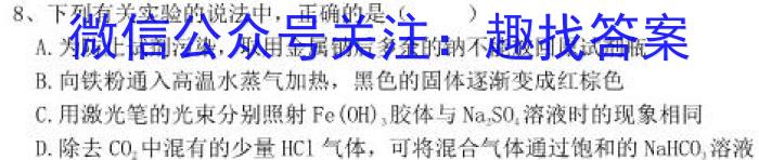 8、下列有关实验的说法中,正确的是()A.为防止试剂污染,取用金属钠后多余的钠不能放回原试剂瓶B.向铁粉通入高温水蒸气加热,黑色的固体逐渐变成红棕色C.用激光笔的光束分别照射Fe(OH)3胶体与Na2SO4溶液时的现象相同D.除去CO2中混有的少量HCl气体,可将混合气体通过饱和的NaHCO3溶液