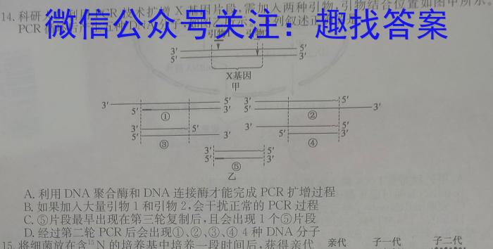 14科研人利用PCR技术扩增X基因片段,需加人两种引物,引物结合位置如图甲所示。PCR循环后产生五种DNA分子,如图乙所示。下列叙述正确的是A.利用DNA聚合酶和DNA连接酶才能完成PCR扩增过程B.如果加入大量引物1和引物2,会干扰正常的PCR过程C.⑤片段最早出现在第三轮复制后,且会出现1个⑤片段D.经过第二轮PCR后会出现①、②、③、④4种DNA分子