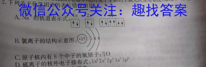 2.下列关于化学用语的表示错误的是B.氯离子的结构示意图:A.Na^+的轨道表示式C.原子核内有8个中子的氧原子:8OD.硫离子的核外电子排布式:1s^22s^22p^63s^23p^6