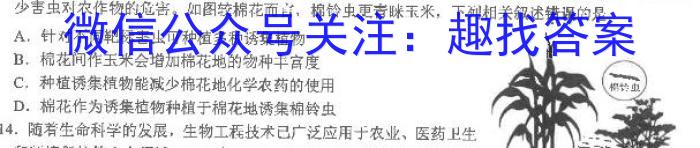 13.种植诱焦植物是指将靶标害虫更睐的寄主植物种植于衣作物邻近,以吸引害虫侵染、产卵来减少害虫对农作物的危害。如图较棉花而言,棉铃虫更青睐玉米,下列相关叙述错误的是A.针对不同靶标害虫可种植多种诱集植物B.棉花间作玉米会增加棉花地的物种丰宫度C.种植诱集植物能减少棉花地化学农药的使用D.棉花作为诱集植物种植于棉花地诱集棉铃虫