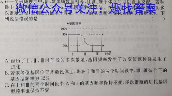 8.在一个果蝇种群中,雌、雄果蝇数量相等,且雌、雄个体之间可以自由交配。若种群中A的基因频率为0%,a的基因频率为20%。在I、Ⅱ、Ⅲ时间段都经历多次繁殖过程,定期随机抽取计算出A和a的基因频率变化曲线(如图所示)。下列说法错误的是()A.经历了I、、Ⅲ时间段的多次繁殖,基因频率发生了改变使该种群发生了进化B.若该等位基因位于常染色体上,则在I和Ⅲ的两个时间段中,雌、雄杂合子的基因型频率为32%C.在I和Ⅲ的两个时间段中A和a的基因频率保持不变,多次繁殖的后代基因型频率也保持不变