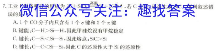 7.工业上制备粗硅的反应为2C+SiO2高温Si+2CO,若C过量,还会生成SiC。下列误的是A.1个CO分子内只含有1个σ键和2个π键B.键能:C-H>Si-H,,因此甲硅烷没有甲烷稳定C.键长:C-SiSiD.键长:C-C<Si-Si,,因此C的还原性大于Si的还原性