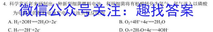 4.科学家近年来研制出一种新型细菌燃料电池,利用细菌将有机酸转化为氢气,氢气进入以磷酸为电解质的燃料电池发电。电池负极反应为A.H2+2OH=2H2O+2e^-B.O2+4H^++4e^-2H2OC.H22H^++2e^-D.O2+2H2O+4e4OH^-