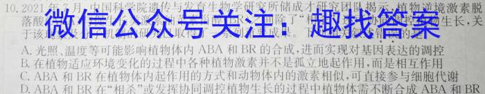 10.2021年7月,中国科学院遗传与发育生物学研究所储成才研究团队揭示,植物逆境激素脱落酸(ABA))与促生长类激素油菜素甾醇(BR)之间除了“相杀”,还可协同调控植物生长,关于该现象及分子机制的研究已取得了一系列重要成果。下列相关叙述错误的是A.光照、温度等可能影响植物体内ABA和BR的合成,进而实现对基因表达的调控B.在植物适应环境变化的过程中各种植物激素并不是孤立地起作用,而是相互作用C.ABA和BR在植物体内起作用的方式和动物体内的激素相似,可直接参与细胞代谢D.ABA和BR在“相杀”或发挥协同调控植物生长的过程中植物体需不断合成ABA和BR