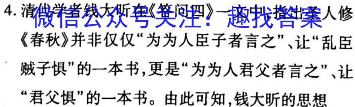 4.清代学者钱大昕在《答问四》一文中,指出圣人修《春秋》并非仅仅“为为人臣子者言之”、让“乱臣贼子惧”的一本书,更是“为为人君父者言之”、让“君父惧”的一本书。由此可知,钱大昕的思想A.强化了社会主流价值观B.体现了经世致用的理念C.反思了儒学的伦理观念D.彰显了严谨的考据学风
