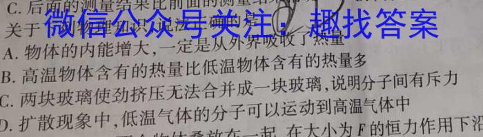 12.关于下列物理知识,说法正确的是A.物体的内能增大,一定是从外界吸收了热量B.高温物体含有的热量比低温物体含有的热量多C.两块玻璃使劲挤压无法合并成一块玻璃,说明分子间有斥力D.扩散现象中,低温气体的分子可以运动到高温气体中