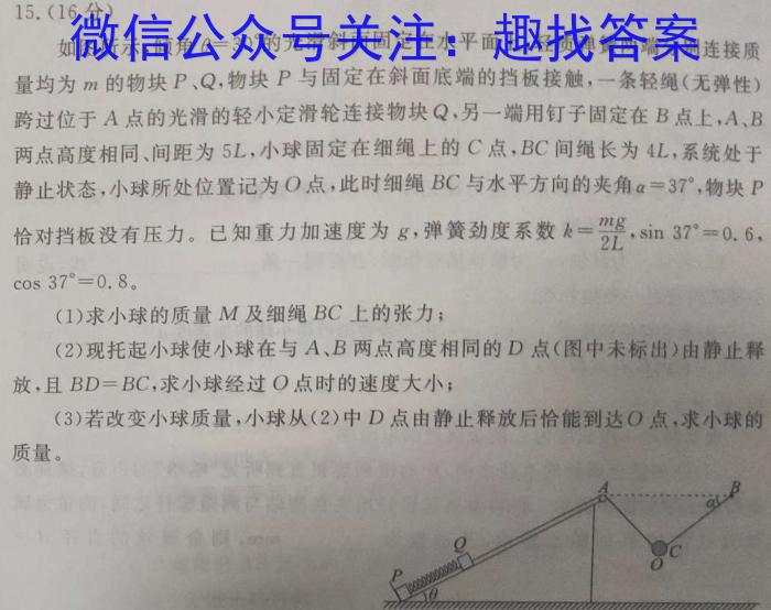 15.(16分)如图所示,倾角=30^的光滑斜面固定在水平面上,轻质弹簧两端分别连接质量均为m的物块P、Q,物块P与固定在斜面底端的挡板接触,一条轻绳(无弹性)跨过位于A点的光滑的轻小定滑轮连接物块Q,另一端用钉子固定在B点上,A、B两点高度相同、间距为5L,小球固定在细绳上的C点,BBC间绳长为4L,系统处于静止状态,小球所处位置记为点,此时细绳BC与水平方向的夹角=37^,物块P恰对挡板没有压力。已知重力加速度为,g,弹簧劲度系数k=mg2L,37^=0.6,37^=0.8。(1)求小球的质量M及细绳BC上的张力;(2)现托起小球使小球在与A、B两点高度相同的D点(图中未标出)由静止释放,且BD=BC,,求小球经过点时的速度大小;(3)若改变小球质量,小球从(2)中D点由静止释放后恰能到达O点,求小球的质量。