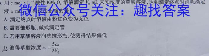 6.用cmolL^-1酸性KMnO4溶液滴定V0mL未知浓度的草酸溶液,达到滴定终点时消耗滴定液xmL。,下列说法正确的是A.滴定终点时溶液由粉红色变为无色B.需要锥形瓶、碱式滴定管C.若用草酸溶液润洗锥形瓶,使测得结果偏低D.测得草酸浓度c0=5cx2V0