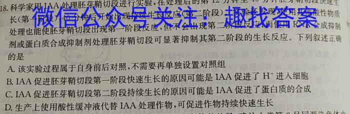 18.科学家用IAA处理胚芽鞘切段进行实验,在处理后的第12分钟至40分钟胚芽鞘切段快速生长(第一阶段),40分钟后开始出现持续生长反应(第二阶段)。实验还发现,使用其他酸性物质处理也能使胚芽鞘切段出现第一阶段反应,但不会出现第二阶段反应;而使用RNA合成抑制剂或蛋白质合成抑制剂处理胚芽鞘切段可显著抑制其第二阶段的生长反应。下列叙述正确的是A.该实验过程属于自身前后对照,不需要再单独设置对照组B.IAA促进胚芽鞘切段第一阶段快速生长的原因可能是IAA促进了H^+进入细胞C.IAA促进胚芽鞘切段第二阶段持续生长的原因可能是IAA促进了蛋白质的合成D.生产上使用酸性缓冲液代替IAA处理作物,可促进作物持续快速生长
