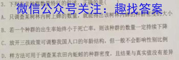 3.下列有关种群数量特征的叙述,正确的是()A.只调查某树林内树上蝉的数量,就能得出该树林内蝉的种群密度的大小B.若一个种群的出生串始终小于死亡率,则该种群的数量一定持续下降C.放开三孩政策可调整我国人口的年龄结构,但一般不会影响性别比例D.样方法可用于调查某农田内蚯蚓的种群密度,且结果与真实值没有差异