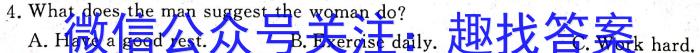4.What does the man suggest the woman do?A.Have a good rest. B.Exercise daily. C.Work hard.