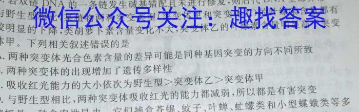 5.D.若双链DNA的一条链发生碱基错配且未进行修复,则后代DNA全部异常5.与野生型相比,某植物两种突变类型(突变体甲和突变体乙)的叶绿素含量都有较明显的下降,类胡萝卜素含量变化不大,突变体乙的叶绿素含量明显高于突变体甲。下列相关叙述错误的是A.两种突变体光合色素含量的差异可能是同种基因突变的方向不同所致B.两种突变体的出现增加了遗传多样性C.吸收红光能力的大小依次为野生型>突变体乙>突变体甲D.与野生型相比,两种突变体吸收红光的能力都减弱,所以都是有害突变