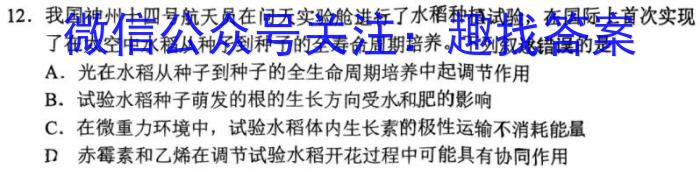 12.我国神州十四号航天员在问天实验舱进行了水稻种植试验,在国际上首次实现了在太空中水稻从种子到种子的全寿命周期培养。下列叙述错误的是A.光在水稻从种子到种子的全生命周期培养中起调节作用B.试验水稻种子萌发的根的生长方向受水和肥的影响C.在微重力环境中,试验水稻体内生长素的极性运输不消耗能量D赤霉素和乙烯在调节试验水稻开花过程中可能具有协同作用