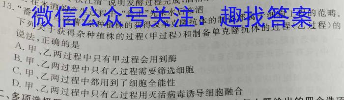 13D.在米酒的产生过程中,“瓮中”先来水后来酒细胞工程的范畴。13.“番茄一马铃薯”植株的获得及单克隆抗体的制备都属于细胞工程的范畴。列”杂杂(乙过程)的说法,正确的是下列关于获得植株的过程(甲过程)和制备单克隆抗体的过程(乙过程)的A.A.甲、乙两过程中只有甲过程会用到酶B.甲、乙两过程中只有乙过程需要筛选细胞C.甲、乙两过程中都用到了细胞全能性.