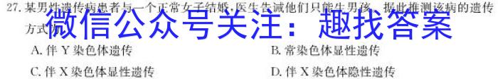27.某男性遗传病患者与一个正常女子结婚,医生告诫他们只能生男孩。据此推测该病的遗传方式为A.伴Y染色体遗传B.常染色体显性遗传C.伴X染色体显性遗传D.伴X染色体隐性遗传