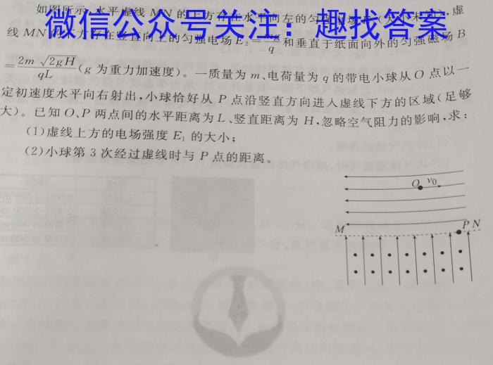 14.(12分)如图所示,水平虚线MN的上方存在水平向左的匀强电场E(大小未知),虚E1B线MN的下方存在竖直向上的匀强电场EE2=mgq和垂直于纸面向外的匀强磁场=2m2gHqL(g为重力加速度)。一质量为m、电荷量为q的带电小球从O点以q定初速度水平向右射出,小球恰好从P点沿竖直方向进入虚线下方的区域(足够大)。已知O、P两点间的水平距离为L、竖直距离为H,忽略空气阻力的影响,求:(1)虚线上方的电场强度E1的大小;(2)小球第3次经过虚线时与P点的距离。