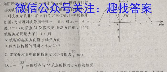 6.如图所示,波源O沿y轴作简谐运动,形成两列简谐横波,一列波在介质I中沿x轴正方向传播,另一列波在介质Ⅱ中沿x轴负方向传播.t=0时波形如图,此时两列波分别传到x1=6m和x2=-4m处.t=1s时质点M位移不变,振动方向相反,已知波源振动周期大于0.4s.则()A.波源的起振方向沿y轴负方向B.两列波传播的周期之比为2:3C.波在介质Ⅱ中的传播速度大小可能为203m/sD.x=-383m的质点与M质点的振动方向始终相反