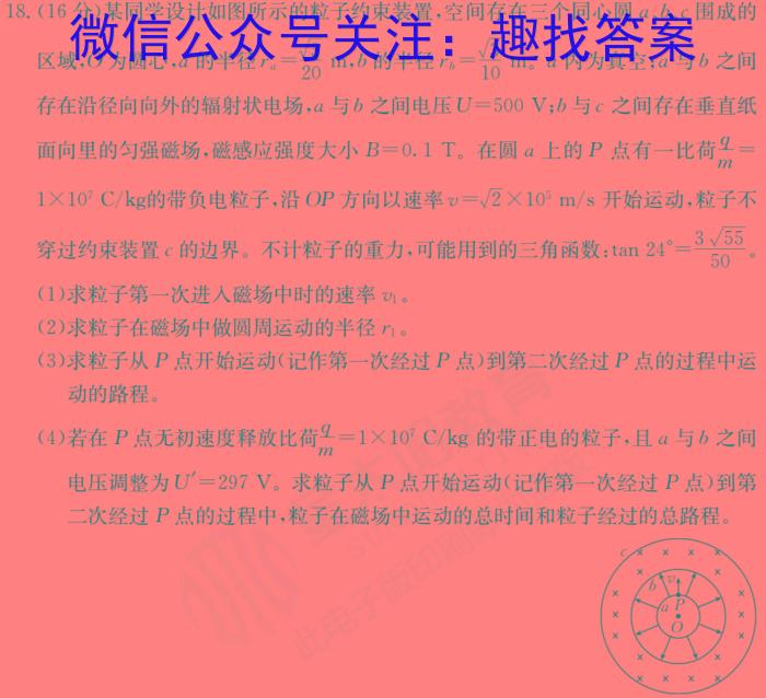 18.(16分)某同学设计如图所示的粒子约束装置,空间存在三个同心圆a、b、c围成的区域,O为圆心,a的半径ra=320m,b的半径rb=310m,a内为真空;a与b之间存在沿径向向外的辐射状电场,a与b之间电压U=500V;b与c之间存在垂直纸面向里的匀强磁场,磁感应强度大小B=0.1T。a上的P点有一比荷qm=110^7C/kg的带负电粒子,沿OP方向以速率v=210^5m/s开始运动,粒子不穿过约束装置c的边界。不计粒子的重力,可能用到的三角函数:tan:24^=35550。(1)求粒子第一次进入磁场中时的速率v1(2)求粒子在磁场中做圆周运动的半径r1。(3)求粒子从P点开始运动(记作第一次经过P点)到第二次经过P点的过程中运动的路程。(4)若在P点无初速度释放比荷qm=110^7C/kg的带正电的粒子,且a与b之间电压调整为U’=297V。求粒子从P点开始运动(记作第一次经过P点)到第二次经过P点的过程中,粒子在磁场中运动的总时间和粒子经过的总路程。