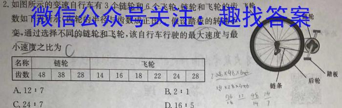 2.如图所示的变速自行车有3个链轮和6个飞轮,链轮和飞轮的齿数如下表所示(齿轮的半径与齿数成正比)。假设踏板的转速不变,通过选择不同的链轮和飞轮,该自行车行驶的最大速度与最小速度之比为C飞轮链轮×48×62踏板后轮14链条A.12:7B.2:1C.24:7D.16:596&1648&144&7