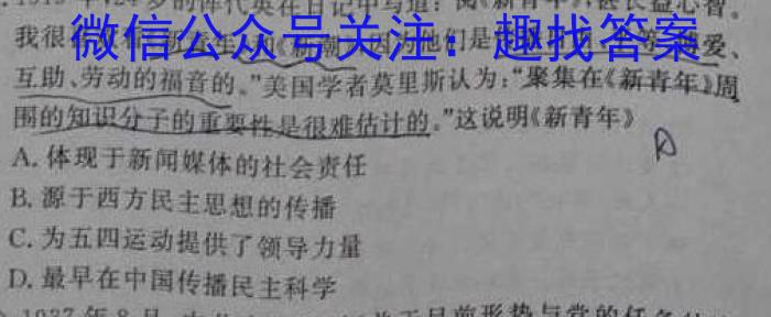 9.1919年,24岁的挥代英在日记中写道:“阅(新青年》,甚长益心智。我很喜欢看(新青年》和《新满》,因为他们是传播自由、平等、博爱、互助、劳动的福音的。”美国学者莫里斯认为:“聚集在(新青年》周围的知识分子的重要件是很难估计的。”这说明新青年》》A.体现于新闻媒体的社会责任B.源于西方民主思想的传播C.为提供了领导力量D.最早在中国传播民主科学