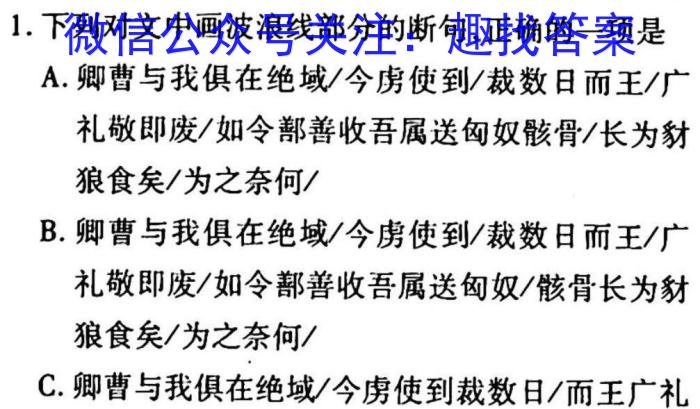 1.下列对文中画波浪线部分的断句,正确的一项是A.卿曹与我俱在绝域/今虏使到/裁数日而王/广礼敬即废/如令善收吾属送匈奴骸骨/长为豺狼食矣/为之奈何/B.卿曹与我俱在绝域/今虏使到/裁数日而王/广礼敬即废/如令部善收吾属送匈奴/骸骨长为豺狼食矣/为之奈何/C.卿曹与我俱在绝域/今虏使到裁数日/而王广礼敬即废/如令部善收吾属送匈奴骸骨/长为豺狼食矣/为之奈何/D.卿曹与我俱在绝域/今虏使到裁数日/而王广礼敬即废/如令部善收吾属送匈奴/骸骨长为豺狼食矣/为之奈何/