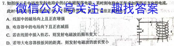 7.如图所示是电磁波发射电路中的LC电磁振荡电路,某时刻电路中正形成如图所示方向的电流,此时电容器的上极板带正电,下极板带负电,则以下说法正确的是():A.线圈中的磁场向上且正在增强B.电容器中的电场向下且正在减弱C.若在线圈中插入铁芯,则发射电磁波的频率变大D.若增大电容器极板间的距离,则发射电磁波的波长变小c