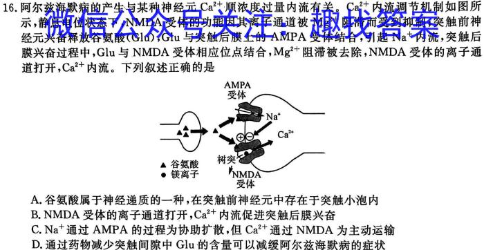 16.阿尔兹海默病的产生与某种神经元Ca^2-+顺浓度过量内流有关。Ca^2+内流调节机制如图所示,静息电位状态下,NMDA受体的功能因其离子通道被Mg^2+阻滞而受到抑制;突触前神经元兴奋释放谷氨酸(Glu),Glu与突触后膜上的AMPA受体结合,引起Na^+内流,突触后膜兴奋过程中,Glu与NMDA受体相应位点结合,Mg^2+阻滞被去除,NMDA受体的离子通道打开,Ca^2+内流。下列叙述正确的是A.谷氨酸属于神经递质的一种,在突触前神经元中存在于突触小泡内B.NMDA受体的离子通道打开,Ca^2+内流促进突触后膜兴奋C.Na^+通过AMPA的过程为协助扩散,但Ca^2+通过NMDA为主动运输D.通过药物减少突触间隙中Glu的含量可以减缓阿尔兹海默病的症状