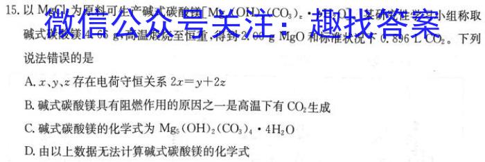 15.以MgCl2为原料可生产碱式碳酸镁[Mgx(OH)y(CO3)2pH2O]。,某研究性学*小组称取碱式碳酸镁4.66g,高温煅烧至恒重,得到2.00gMgO和标准状况下0.896LCO2。,下列说法错误的是A.x、y、存在电荷守恒关系2x=y+2zB.碱式碳酸镁具有阻燃作用的原因之一是高温下有CO2生成C.碱式碳酸镁的化学式为Mg5(OH)2(CO3)44H2OD.由以上数据无法计算碱式碳酸镁的化学式