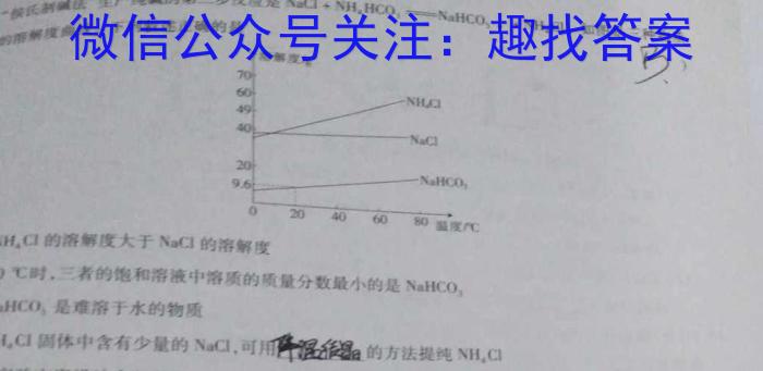 “法“生产纯碱的第二步反应是NaC÷NH,HCO,-Nal的度曲线。下列叙述正确的是NaCl+NH4HCO3NaHCO3+NH4Cl。、.+NH,C。如图是三种物70B49NHACl40NaCl299.6NaHCO320A.NH,Cl的溶解度大于NaCl的溶解度40A.NH4Cl60NaCl800B.60^CC.NaHCO3C.NaHCO,是难溶于水的物质B.60℃时,三者的饱和溶液中溶质的质量分数最小的是NaHCO,NaHCO3D.NH4Cl