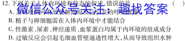 12.下列关于人体内环境和稳态的叙述,错误的是()A.及时吸氧可有效缓解高原反应引发的呼吸困难B.精子与卵细胞需在人体内环境中才能结合C.性激素、尿素、神经递质、血浆蛋白均属于内环境的组成成分D.过敏反应会引起毛细血管壁通透性增大,从而导致组织水肿