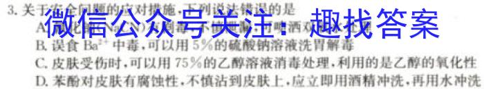 3.关于安全问题的应对措施,下列说法错误的是A.氰化钠(NaCN)有剧毒,不慎泄漏,可喷洒双氧水处理B.误食Ba^2+中毒,可以用5%的硫酸钠溶液洗胃解毒C.皮肤受伤时,可以用75%的乙醇溶液消毒处理,利用的是乙醇的氧化性D.苯酚对皮肤有腐蚀性,不慎沾到皮肤上,应立即用酒精冲洗,再用水冲洗