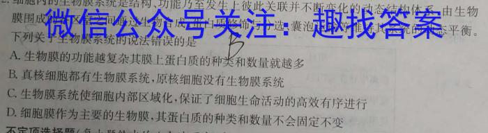12.细胞内的生物膜系统是结构、功能乃至发生上彼此关联并不断变化的动态结构体系,由生物膜围成的各区室之间通过生物合成、蛋白质修饰与分选、囊泡运输等维持其系统的动态平衡。下列关于生物膜系统的说法错误的是BA.生物膜的功能越复杂其膜上蛋白质的种类和数量就越多B.真核细胞都有生物膜系统,原核细胞没有生物膜系统C.生物膜系统使细胞内部区域化,保证了细胞生命活动的高效有序进行D.细胞膜作为主要的生物膜,其蛋白质的种类和数量不会固定不变