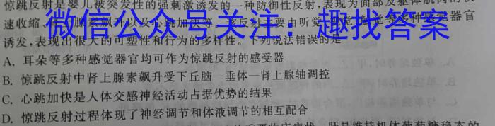 5.惊跳及射是婴儿被突发性的强刺激诱发的一种防御性反射,表现为面部及躯体肌肉的快速收缩、肾上腺素飙升以及心跳加快等。该反射主要由听觉视觉触觉等多种感觉器官诱发,表现出很大的可塑性和行为的多样性。下列说法错误的是A.耳朵等多种感觉器官均可作为惊跳反射的感受器B.惊跳反射中肾上腺素飙升受下丘脑一垂体一肾上腺轴调控C.心跳加快是人体交感神经活动占据优势的结果D.惊跳反射过程体现了神经调节和体液调节的相互配合