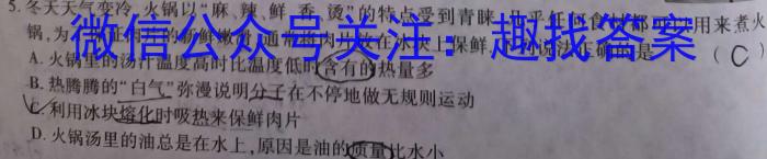 5.冬大大气变冷,火锅以”麻、辣、鲜、香、烫”的特点受到青睐,几乎任何食材都可以者火锅,为了保证肉片的新鲜嫩滑,通常将肉片放在冰块上保鲜,下列说法正确的是A.火锅里的汤汁温度高时比温度低时含有的热量多CB.热腾腾的“白气”弥漫说明分子在不停地做无规则运动\.利用冰块熔化时吸热来保鲜肉片D.火锅汤里的油总是在水上,原因是油的质量比水小