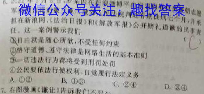 6.2022年5月5日,罗某因在新浪微博平台发表侮抗美潮志军英烈言论而被三亚市城郊人民法院判处有期徒刑七个月,并承担在新浪网,法治日报》和《解放军报》公开赔礼道歉的民事责任,这一案例警示我们自由就是随心所欲,不受任何约束②格守道德,遵守法律是网络生活的基本准则一切违法行为都将受到刑罚处罚④公民要依法行使权利,自觉履行法定义务A.①②B.①③C.②④D.③④