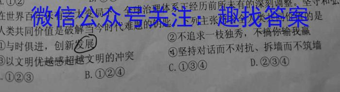 在世界百年未有之大变局下,全球治理人类共同价值是破解当今时代难题的钥匙。下列主张符合全人类共同价值的是②不追求一枝独秀,不搞你输我赢A.①②求治理体系正经历前所未有的深刻是③以文明优越感超越文明的冲突①与时俱进,创新发展④坚持对话而不对抗、拆墙而不筑墙D.②③④C.①③④A.①②③B.①②④