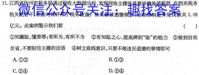 11.江西省抚州市税务局通过税收大数据分析,发现网络主播徐某豪涉嫌偷逃税款,在相关税务机关配合下,依法对其开展了税务检查。徐某豪被追缴税款、加收滞纳金并处罚款共1.08亿元。此案例警示我们要()①知廉耻,懂荣辱;有所为,有所不为②有知耻之心,提高辨别“耻”的能力③做到自我反省,不要轻信主播的话语④树立底线意识,只要不做违反道德的事情即可A.①②B.①③C.③④D.②④