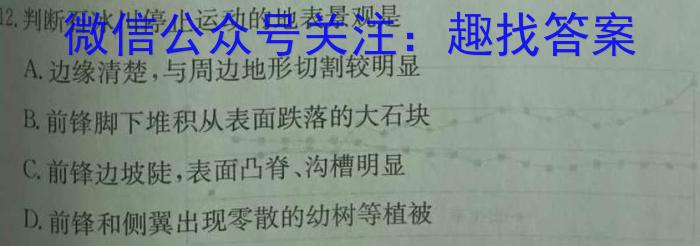 12.判断石冰川停止运动的地表景观是A.边缘清楚,与周边地形切割较明显B.前锋脚下堆积从表面跌落的大石块C.前锋边坡陡,表面凸脊、沟槽明显D.前锋和侧翼出现零散的幼树等植被
