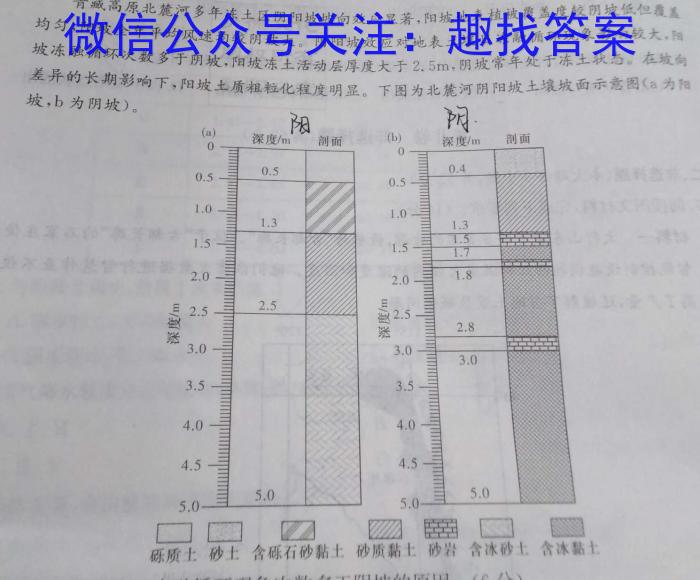 青藏高原北麓河多年冻土区阴阳坡坡向效应显著,阳坡地表植被覆盖度较阴玻低怛覆盖均匀,阳坡全年平均风速均较阴坡大。阴阳坡效应对地表土壤日冻融循环现象影响较大,阳坡冻融循环次数多于阴坡,阳坡冻土活动层厚度大于2.5m,阴坡常年处于冻土状态。在坡向差异的长期影响下,阳坡土质粗粒化程度明显。下图为北麓河阴阳坡土壤坡面示意图(a为阳坡,b为阴坡)。砾质土砂土含砾石砂黏土砂质黏土砂岩含冰砂土含冰黏