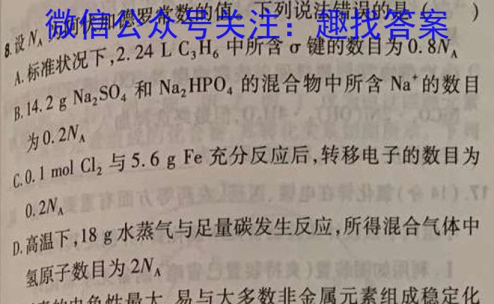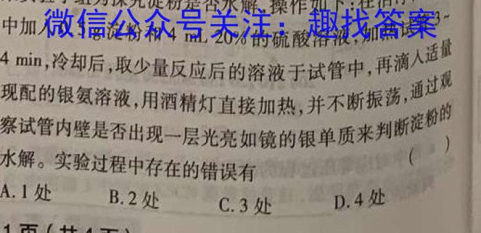 7.某实验小组为探究淀粉是否水解,操作如下:在洁净的试管0.5g中加人0.5g淀粉和4mL20%的硫酸溶液,加热试管3-4mL20%4min,4min,冷却后,取少量反应后的溶液于试管中,再滴人适量现配的银氨溶液,用酒精灯直接加热,并不断振荡,通过粉的察试管内壁是否出现一层光亮如镜的银单质来判断淀粉的)水解。实验过程中存在的错误有A.1处B.2处C.3处DD.4处设为阿伏加德罗常数的值。下列说法错误的是()2.24LC3H60.8NA标准状况下,2.24LC,H。中所含σ键的数目为0.8N标2gNa2SO4Na2HPO4Na^+14.2gNa,SO,和Na,HPO.的混合物中所含Na的数目为0.2NC.0.1molCl25.6gFeC0.1molCl,与5.6gFe充分反应后,转移电子的数目为0.2NAD.高温下,18g水蒸气与足量碳发生反应,所得混合气体中氢原子数目为2NA