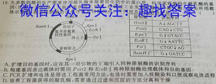 18.大多数奶酪的生产需要使用凝乳酶来凝聚固化奶中的蛋白质。科学家将编码牛凝乳的基示意图,表为限制酶的识别序列及切割位点。苄列相关说法的乳酶。图为所用载BamHIA.扩增目的基因时,应在其一对引物的5^端引入同种限制酶的识别序列B.构建基因表达载体时需用Pvit2和EcoRI两种限制酶处理载体和目的基因C.PCR扩增和电泳是筛选工程菌常用方法,电泳时需要加人**染料以便观察电泳进程D.培养工程菌获得的凝乳酶,需要通过过滤和沉淀的方法分离和干燥