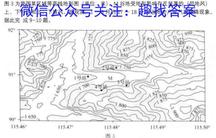 图3为我国某区域等高线地形图(单位:米)。M谷地受地形影响存在显著的(局地风)上、下谷风和上、下坡风。据观测,1一3月的17一18时M谷地会产生气温骤降现象。据此完成9-10题。