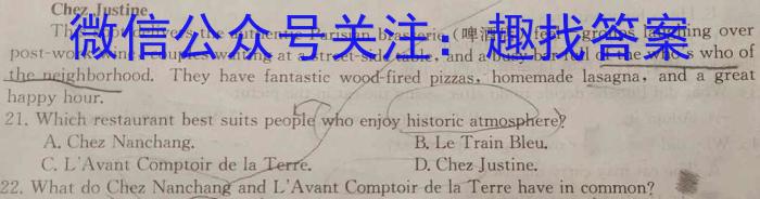 Chez JustineThis spot delivers the authentic Parisian brasserie(啤酒店) feel一groups laughing overpost-work wine, couples waiting at a street-side table, and a busy bar full of the who’s who ofthe neighborhood. They have fantastic wood-fired pizzas, homemade lasagna, and a greathappy hour.Which restaurant best suits people who enjoye who enjoy historic atmosphere?A.Chez Nanchang. B.Le Tra in Bleu.C. LAvant Comptoir de la Ter re. D.Chez Justine.