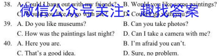 38. A.Could I hang out with my friends?B.Would you like some paintings?C.Would you like to go with me?D.Could I go with you?39. A.Do you like museums? B.Can you take photos?C.How was the paintings last night?D.Can I take a camera with me?40. A.Here you are. B.I’m afraid you can’t.C.That’sa good idea. D.Sure, no problem.