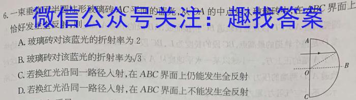 6.一束垂直于半圆柱形玻璃砖AC平面的蓝光,从OA的中点射入玻璃砖中,在ABC界面上恰好发生全反射,则A.玻璃砖对该蓝光的折射率为2B.玻璃砖对该蓝光的折射率为v33C.若换红光沿同一路径入射,在ABC界面上仍能发生全反射D.若换红光沿同一路径入射,在ABC界面上不能发生全反射