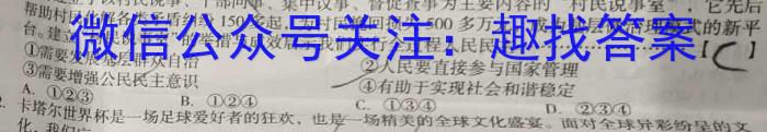 11.某村建立了以村民说事、干部问事、集中议事、督促查事为主要内容的“村民说事室”,它先后帮助村民化解各类矛盾纠纷150多起,为村民挽回损失500多万元,成为基层微治理模式的新半台。建立“村民说事室”的举措与成效启示我们实行全过程人民民主……………….C①需要发展基层群众自治②人民要直接参与国家管理③需要增强公民民主意识④有助于实现社会和谐稳定A.①②③B.①②④C.①③④D.②③④