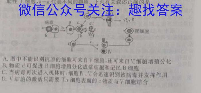 18.下图表示人体对抗病毒的部分免疫过程,I∼M表示不同的免疫细胞,Th为辅助性T细胞,a∼8代表不同的物质。下列有关叙述正确的是病毒配细胞A.图中不能识别抗原的细胞可来自V细胞,还可来自Ⅵ细胞增殖分化B.物质d可促进B细胞增殖分化成浆细胞和记忆B细胞C.当病毒再次进入机体时,细胞Ⅳ,Ⅵ会迅速识别该病毒并发挥作用D.V细胞的激活只需要Th细胞表面的c物质与V细胞结合