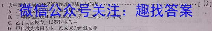 1.表中四个区域的分界线和农业叙述正确的是……………………………………………D.A.乙丙两区域划分主导因素是气候侯B.丁与其他区域分界线大致是地势一二级阶梯分界线C.乙丁两区域农业以畜牧业为主D.甲区域为水田农业,乙区域为灌溉农业
