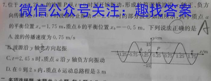 7.,位于x=0.25m的波源P从t=0时刻开始振动,形成的简谐横波沿x轴正、负方向传播,在t=2.0s时波源停止振动,t=2.1s时的部分波形如图所示,其中质点a的平衡位置xa=1.75m,质点b的平衡位置xb=-0.5m。,下列说法正确的是AA.波的传播速度为0.75m/sB.波源沿y轴负方方向起振C.t=2.45s时,质点a沿y轴负方向振动D.在0到2s内,质点b运动总路程是3m