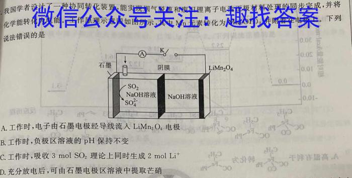 12.我国学者设计了一种协同转化装置,能实现烟气脱硫和废旧锂离子电池正极材料处理的同步完成,并将化学能转化为电能。工作原理示意图如图所示,其中Mn元素转化为Mn(OH):并附着在电极上。下列说法错误的是9A.工作时,电子由石墨电极经导线流入LiMn2O4电极B.工作时,负极区溶液的pH保持不变C.工作时,吸收3molSO2理论上同时生成2molLi^+D.充分放电后,可由石墨电极区溶液中提取芒硝00